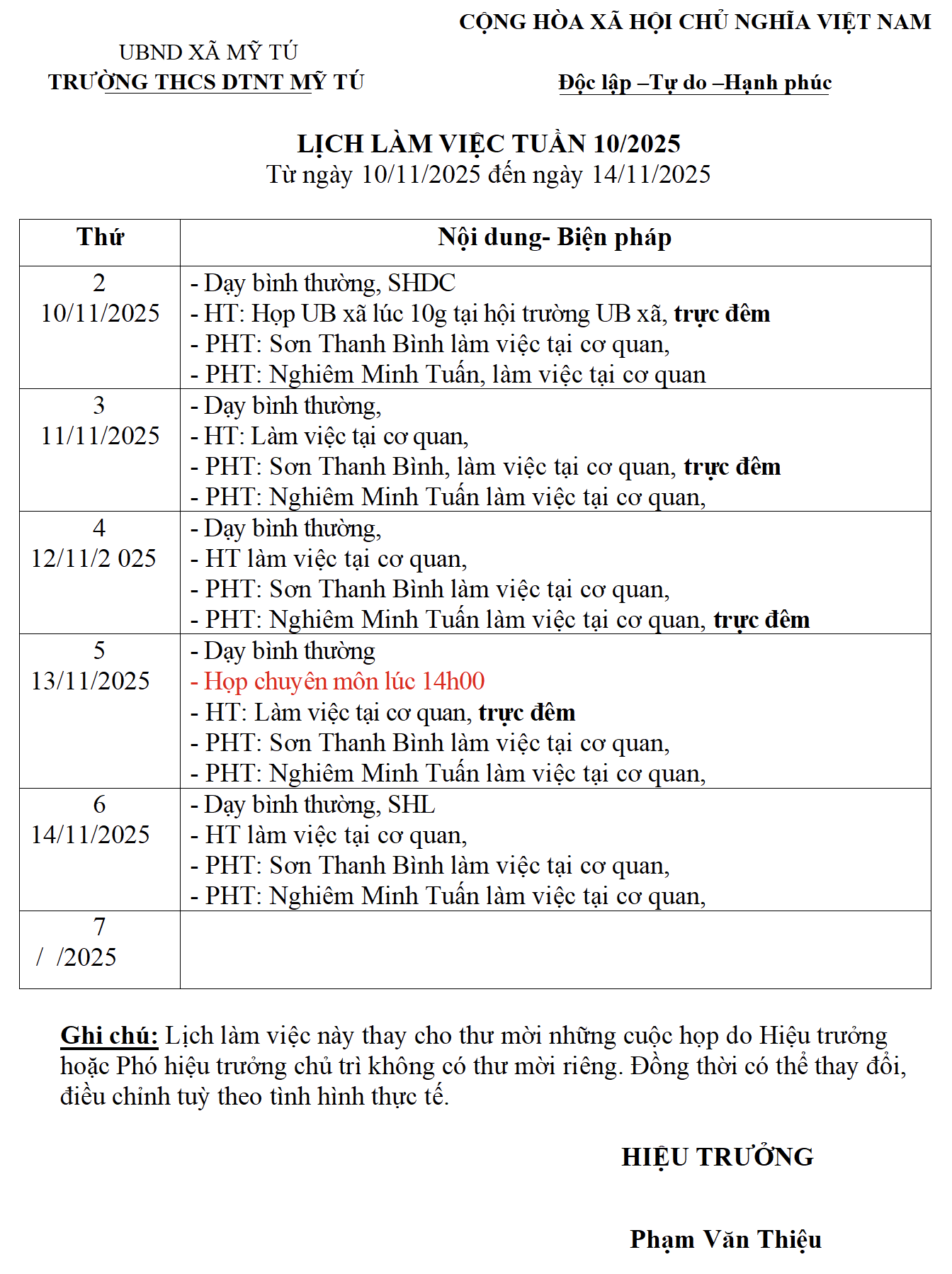 Lịch công tác tuần 10 - 2025 (10/11 - 14/11)