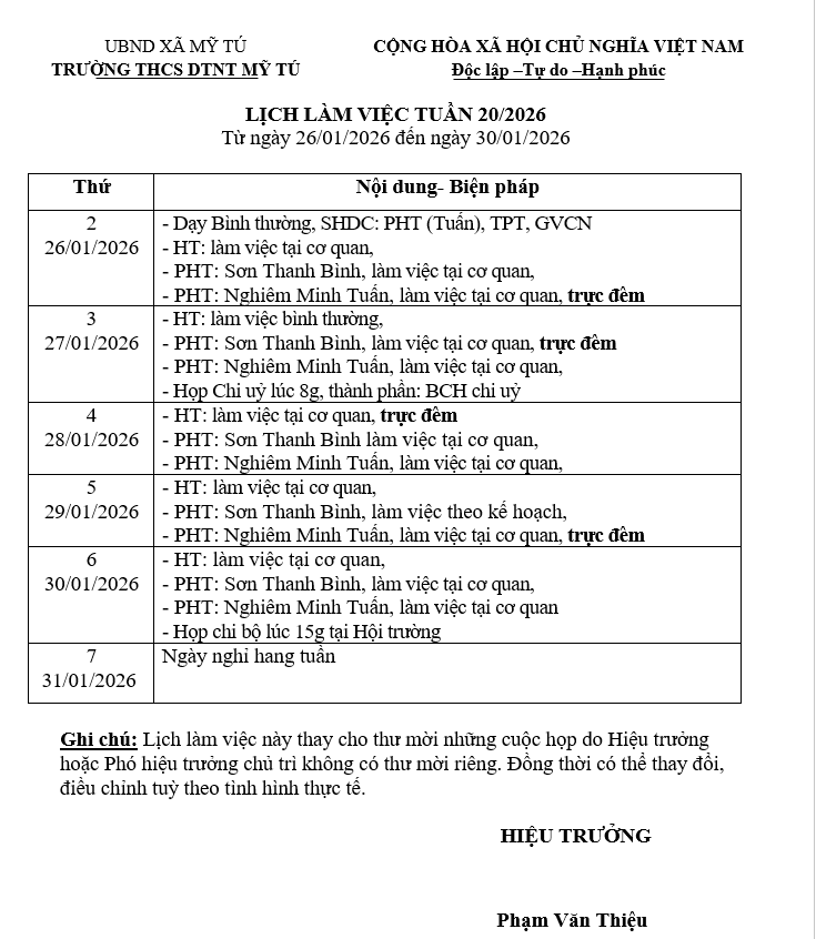 Lịch công tác tuần 20 (26/01/2026-31/01/2026)